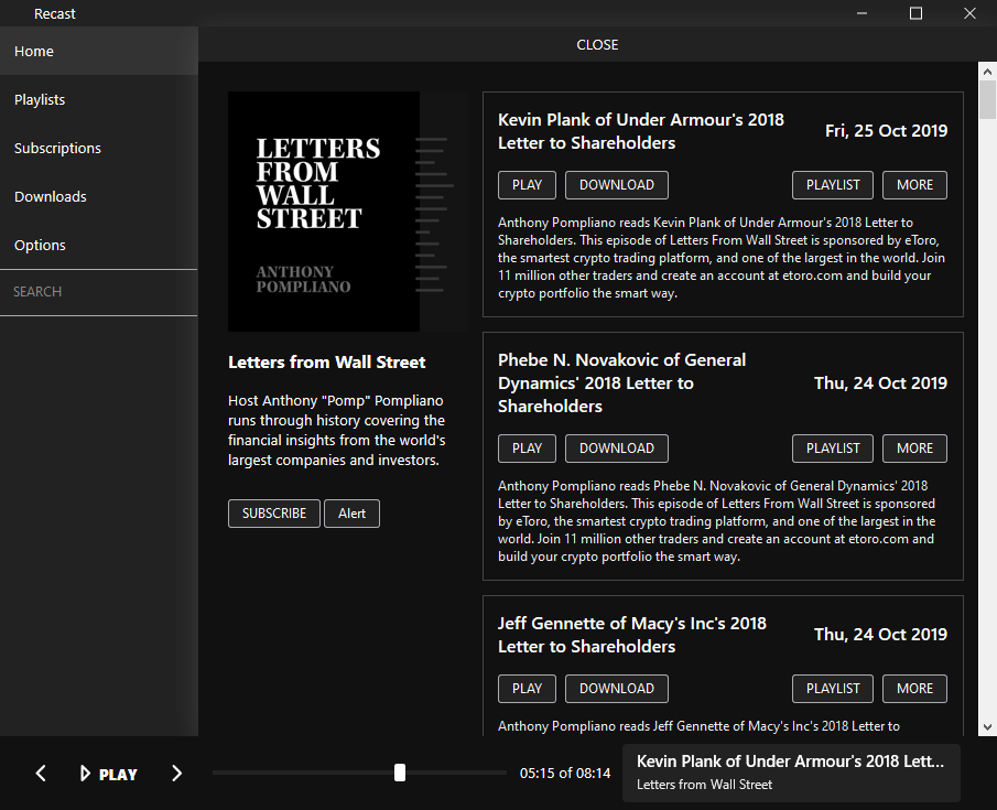 Recast is a rich, light and cross-platform podcast client for desktop (Windows/Mac/Linux)
