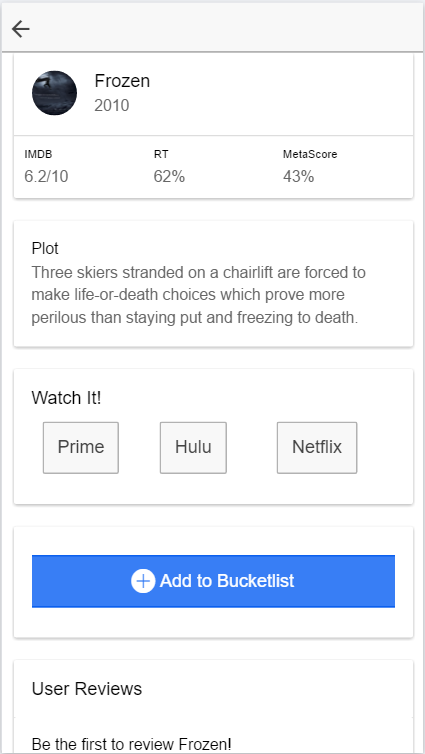 We provide you with unique profiles for movies and their ratings. Along with ratings from IMDB and Rotten Tomatoes, there is a place for you to leave your own opinion on what you thought about it along with unique links to platforms that provide you with access to the movie, including Netflix, Hulu and Amazon.