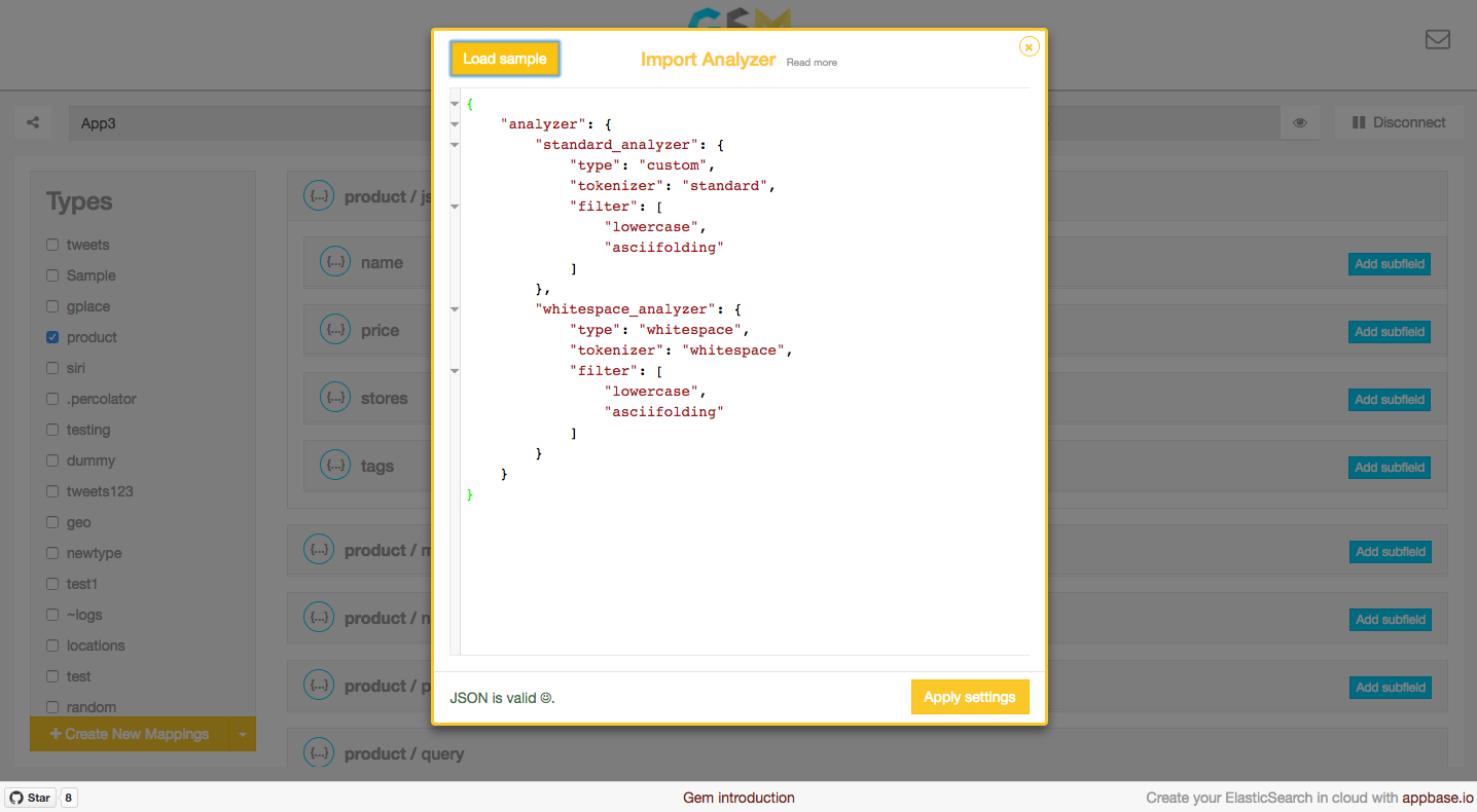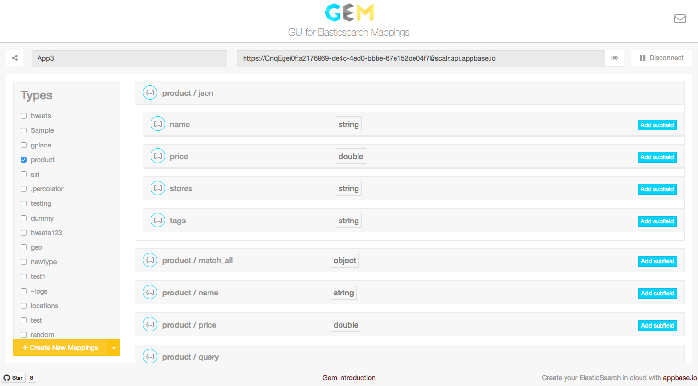 GEM is a GUI for creating and managing an Elasticsearch index's datastructure mappings. ES Mappings provide an immutable interface to control how data is stored internally within Elasticsearch and how queries can be applied to it.