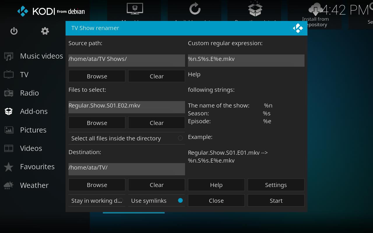 script.customregex A Kodi frontend for ghickman/tvrenamr Screen capture Instructions Build it with make Select the zip file in Kodi License tvrenamr - MIT License defusedxml - PSFL my code - GPLv3