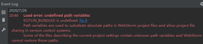 Some of the files describing the current project settings contain unknown path variables and WebStorm cannot restore those paths.