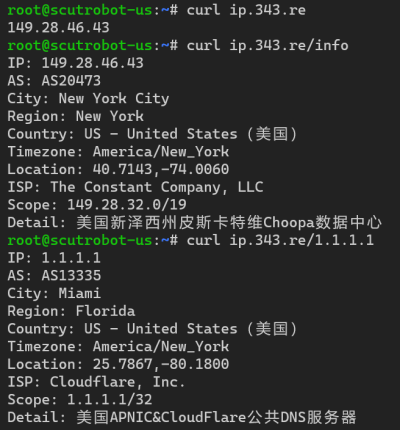 你可以直接在 ip.343.re 或 ip.dnomd343.top 上进行查询,或者将项目部署到自己的服务器上。