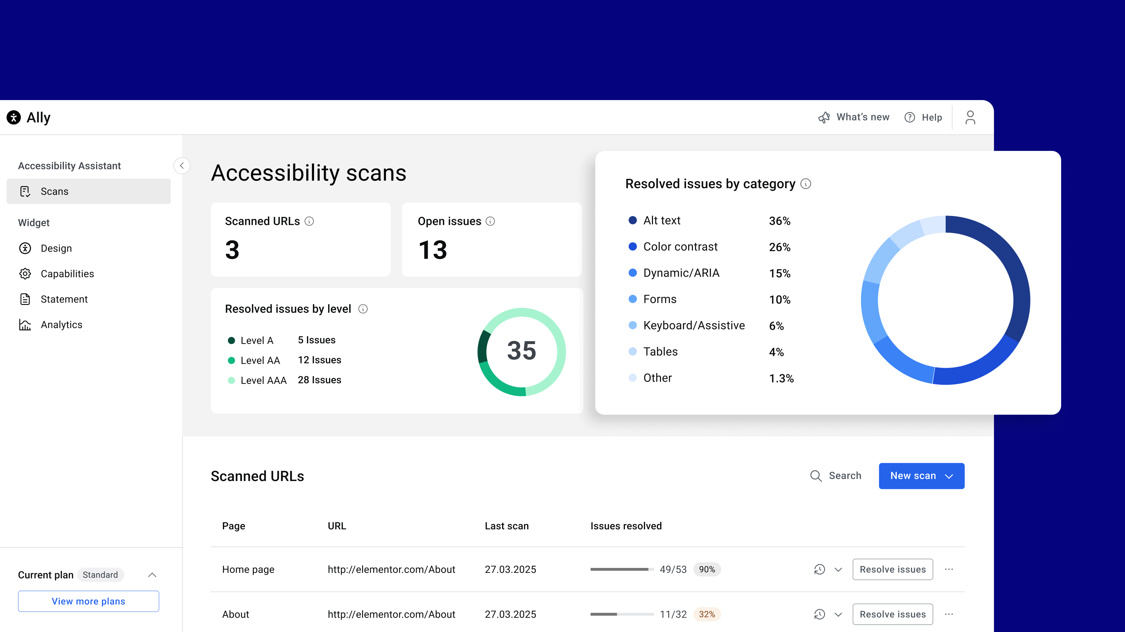 7. Scanner dashboard: Track your site’s accessibility scans, monitor open issues, and follow progress over time.