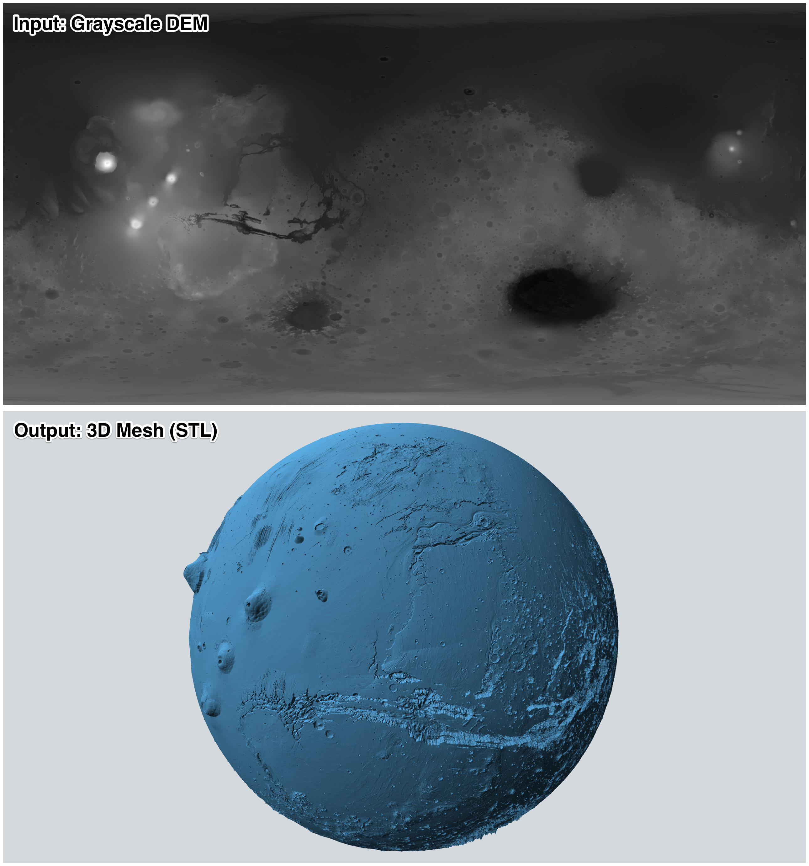 demsphere Generate 3D meshes of planets, moons, etc. from spherical DEMs. Example: Mars with 10x exaggerated elevation, accurate to 50 meters in elevation.