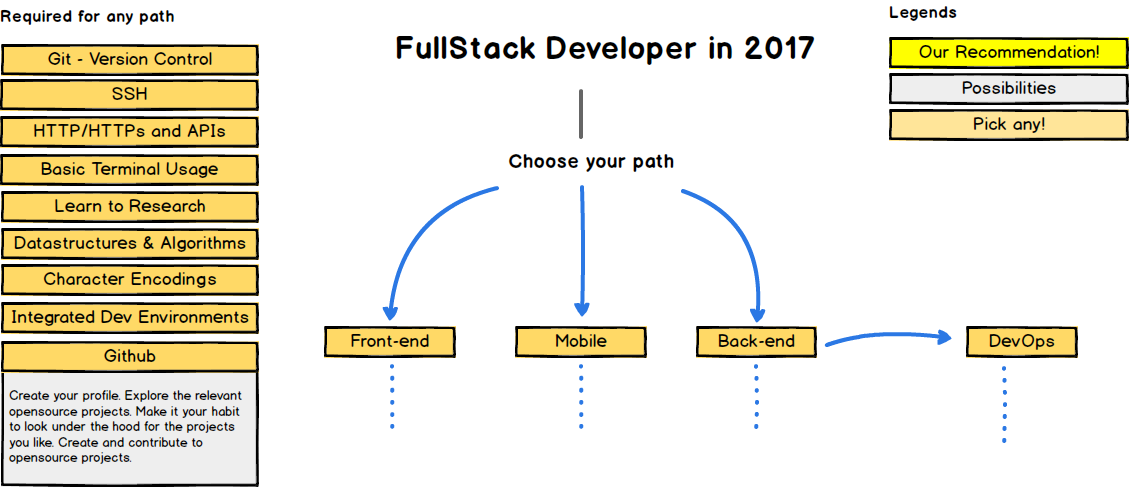 Below you find a set of charts demonstrating the paths that you can take and the technologies that you would want to adopt in order to become a frontend, backend or a devops. I made these charts for an old professor of mine who wanted something to share with his college students to give them a perspective.