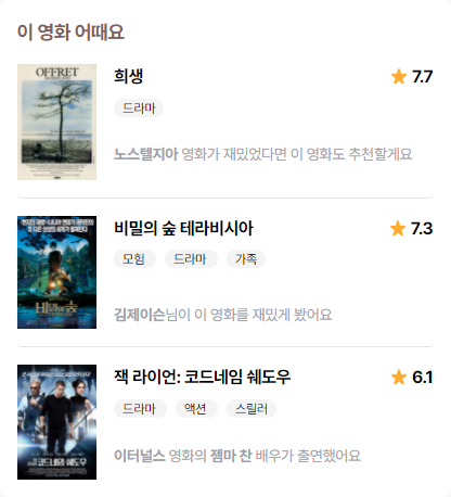 - 영화 리뷰 작성, 유저 팔로잉 등의 활동을 많이 할수록 더 많은 영화 정보가 제공됩니다. 🤗