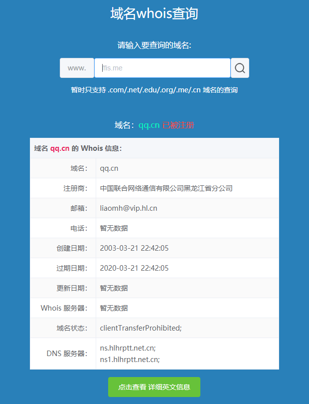 暂时只支持 .com/.net/.edu/.org/.me/.cn 域名的查询