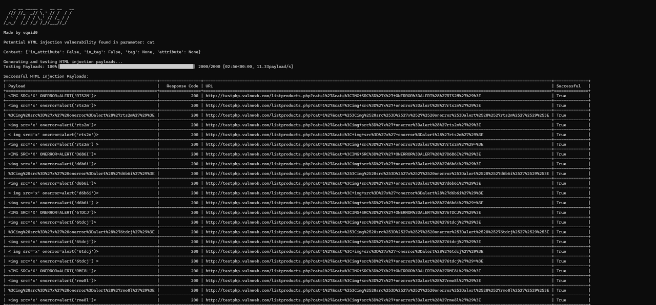 -u,--url: The target website URL.--hpp: Enable HTTP Parameter Pollution testing.--htmli: Enable HTML Injection testing.--xxe: Enable XXE Injection testing.